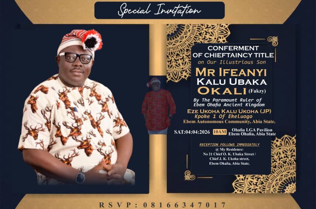 The conferment ceremony is scheduled to take place on Saturday, April 4, 2026, by 10:00 AM Prompt at Ohafia LGA Pavilion, Ebem Ohafia, Abia State