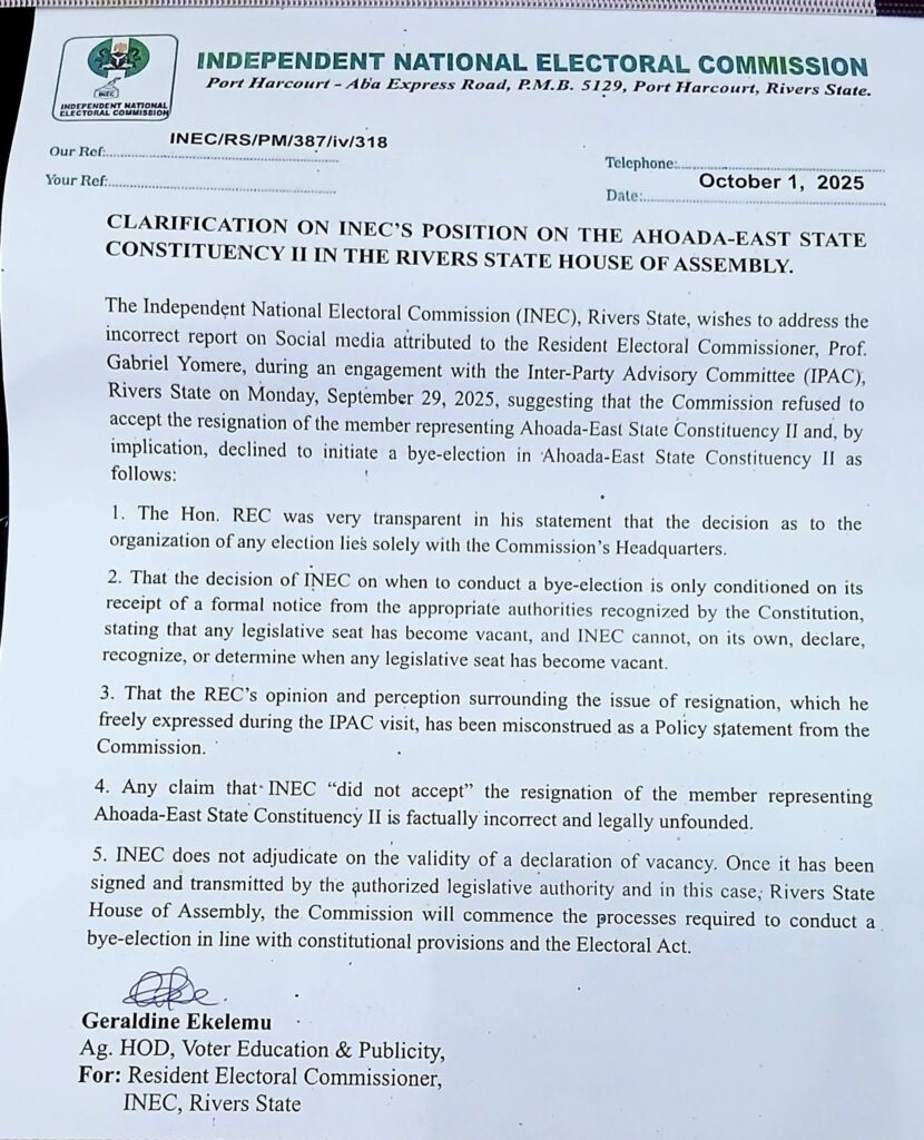 In a statement signed by Geraldine Ekelemu, Acting Head of Voter Education and Publicity, on behalf of the Resident Electoral Commissioner (REC), Prof. Gabriel Yomere, INEC described the reports as a misrepresentation of the REC’s remarks during a meeting with the Inter-Party Advisory Committee (IPAC) in Rivers State on Monday, September 29, 2025.