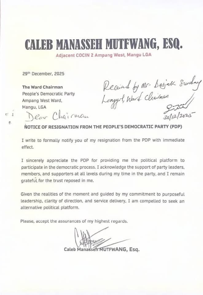 In a resignation letter dated 29 December 2025 and addressed to the Ward Chairman of the PDP, Ampang West Ward, Mangu Local Government Area, Mutfwang notified the party of his decision to withdraw his membership.