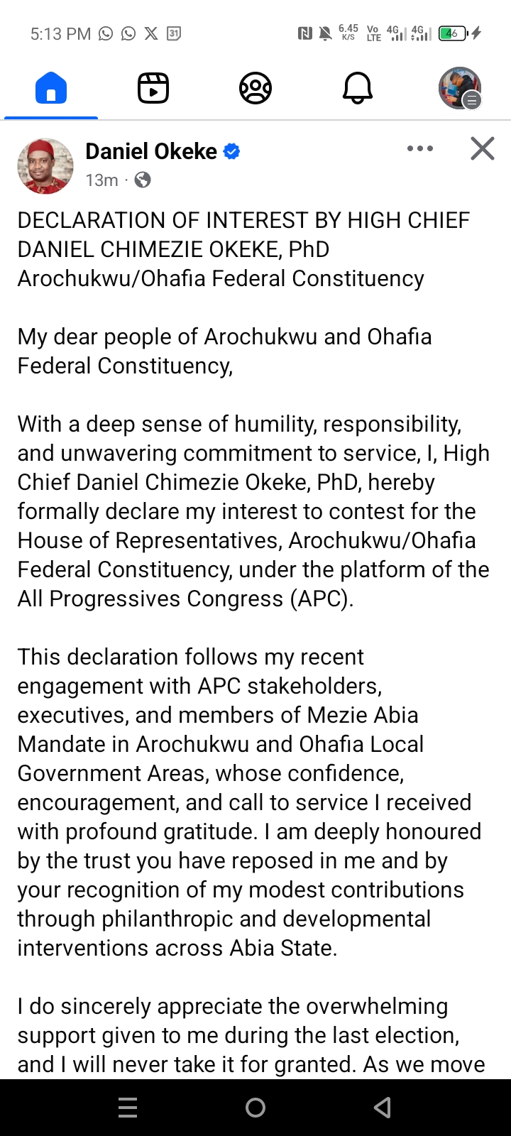 High Chief Daniel Chimezie Okeke, PhD, has formally declared his intention to contest the Arochukwu/Ohafia Federal Constituency seat in the House of Representatives under the platform of the All Progressives Congress (APC).