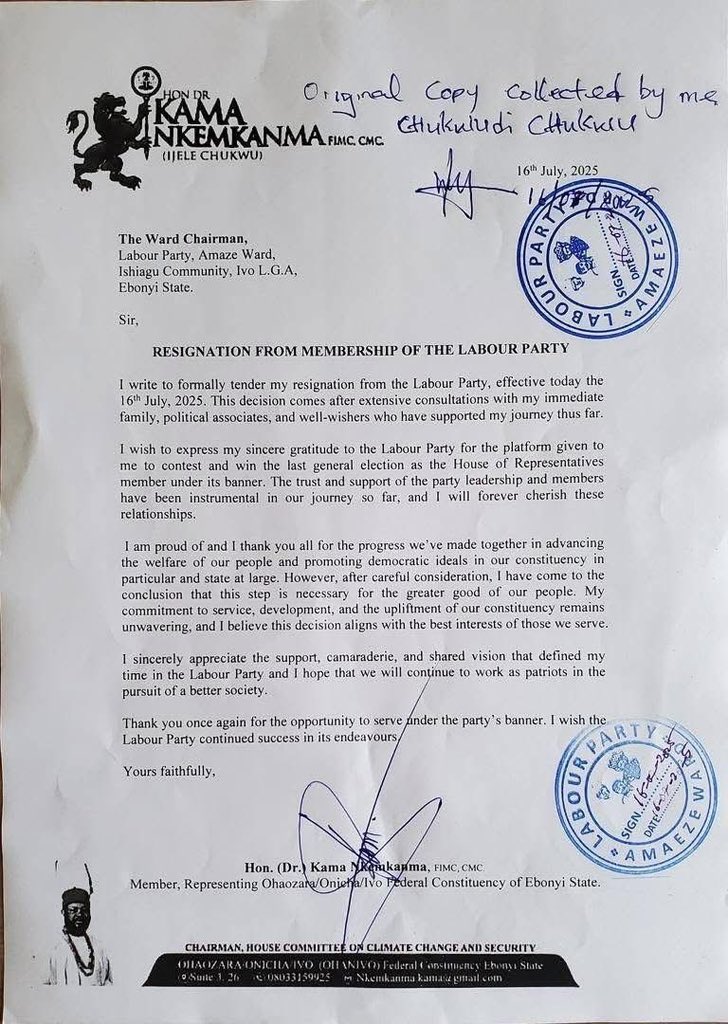 Hon. Dr. Kama Nkemkanma, member representing Ohaozara/Onicha/Ivo Federal Constituency of Ebonyi State in the House of Representatives, has officially resigned from the Labour Party.