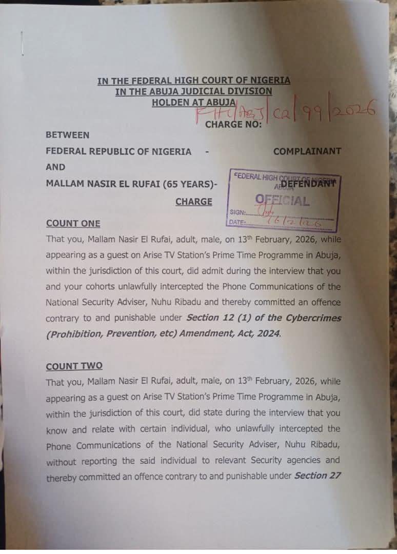 According to the charge sheet dated 16 February 2026, El-Rufai allegedly admitted during a live interview on Arise TV Prime Time programme aired on 13 February 2026 in Abuja that he and others unlawfully intercepted the phone communications of the National Security Adviser.