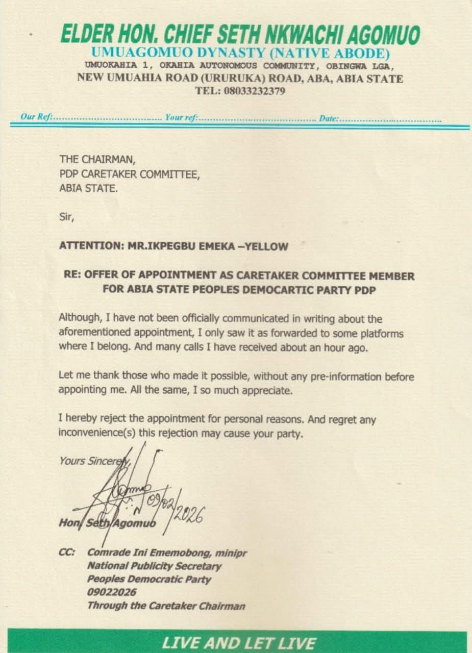 Former Chairman of the Peoples Democratic Party, PDP in Obingwa Local Government Area, Elder Hon. Chief Seth Nkwachi Agomuo, has formally rejected his reported appointment as a member of the Abia State PDP Caretaker Committee.