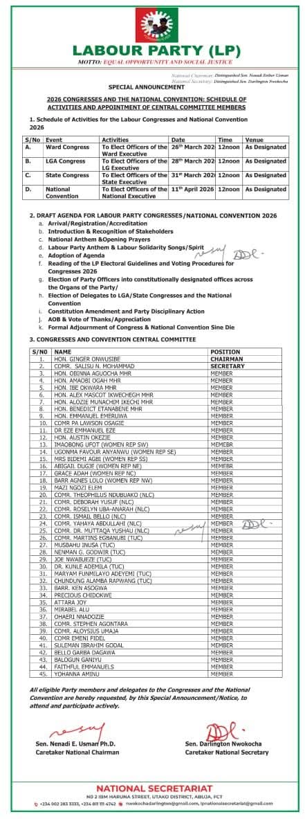 According to a special announcement released by the party’s national secretariat, the congresses are scheduled to hold in phases, beginning with ward congresses, followed by local government and state congresses, before culminating in the national convention in April 2026.