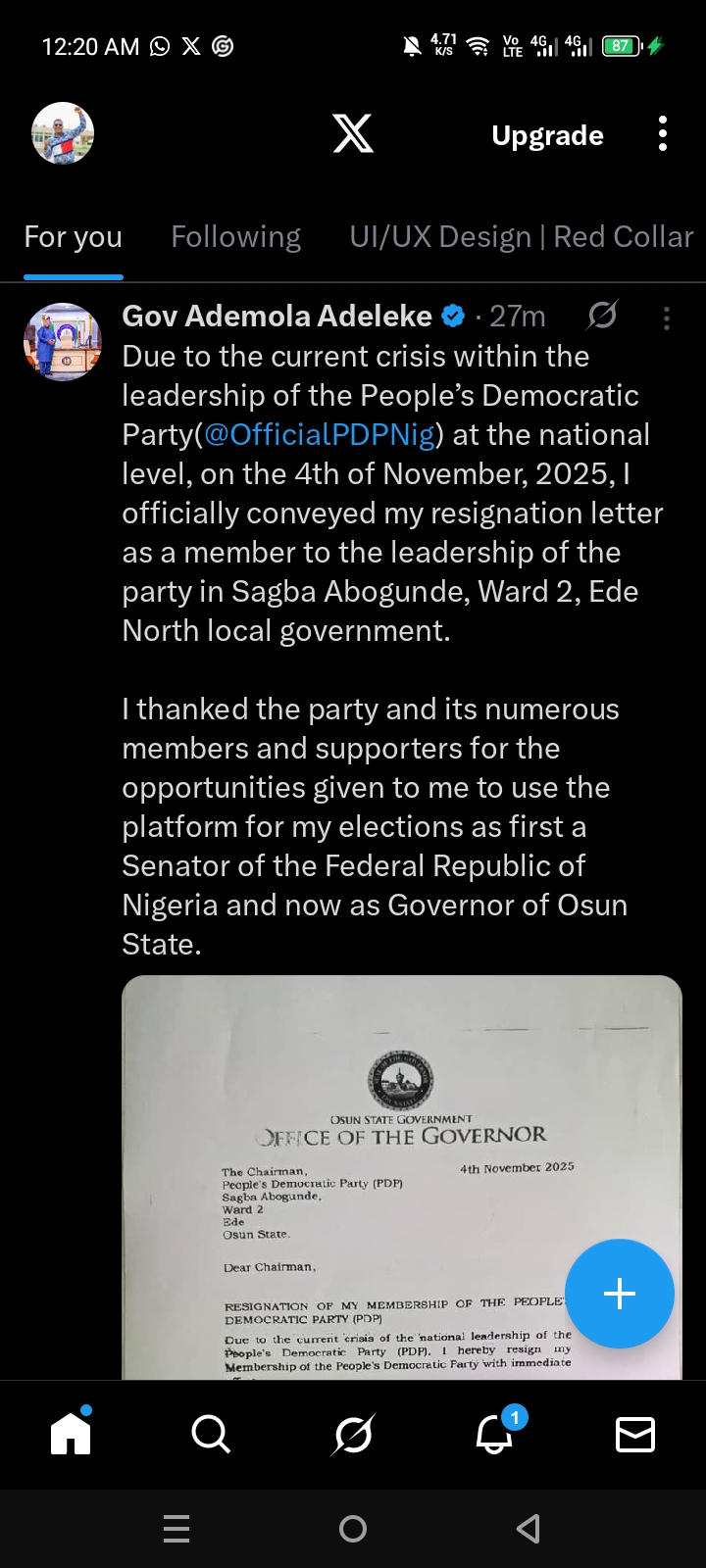 Governor Adeleke announced his resignation from PDP through his official X now twitter handle where he also posted his resignation letter.