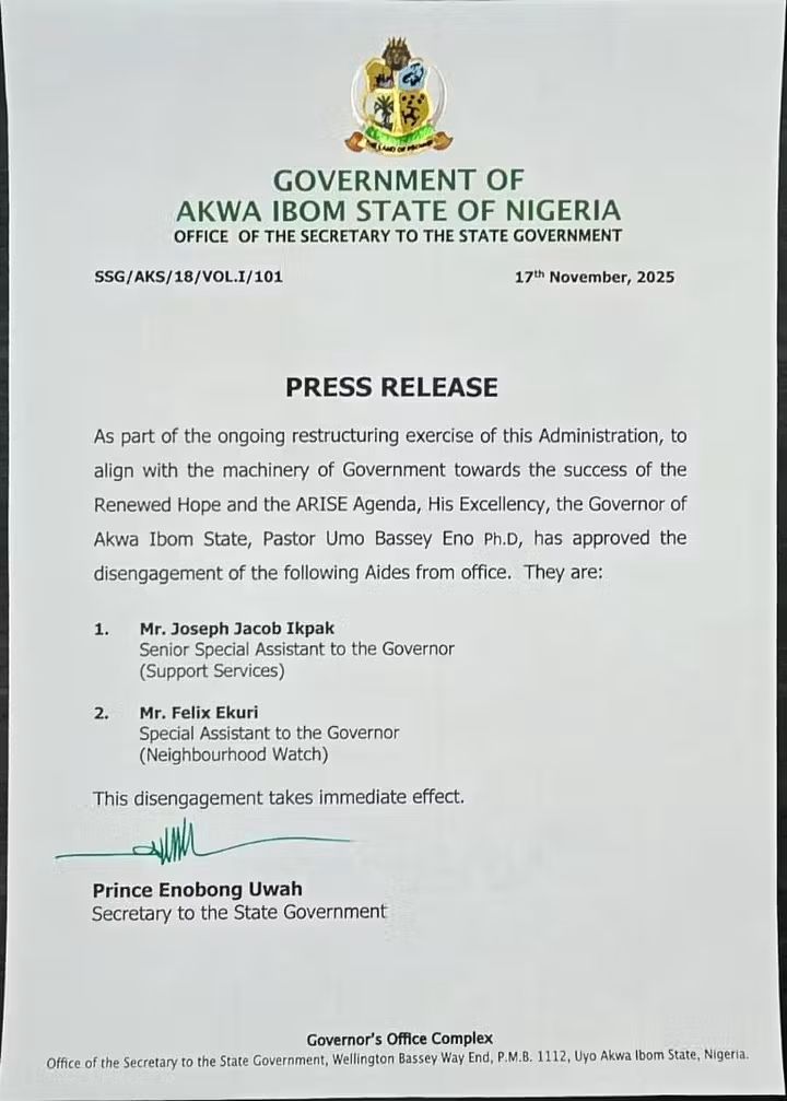Akwa Ibom State Governor, Pastor Umo Bassey Eno, has approved the immediate disengagement of two of his aides over alleged acts of disloyalty linked to their attendance at the recent Peoples Democratic Party (PDP) convention held in Oyo State.