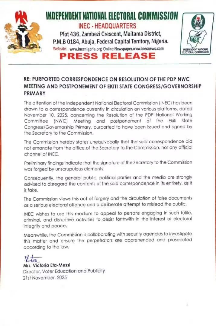 The Independent National Electoral Commission (INEC) has disowned a document circulating on social media claiming that the Commission issued a correspondence regarding the resolution of the Peoples Democratic Party (PDP) National Working Committee (NWC) meeting and the postponement of the Ekiti State Congress/ Governorship Primary.