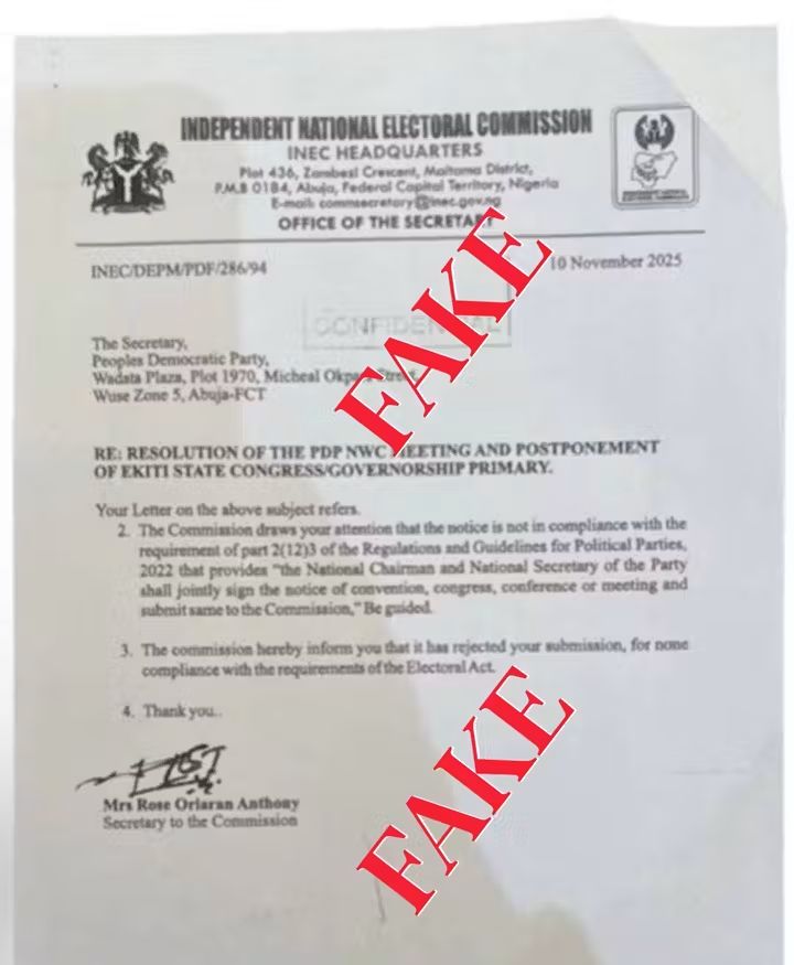 The Independent National Electoral Commission (INEC) has disowned a document circulating on social media claiming that the Commission issued a correspondence regarding the resolution of the Peoples Democratic Party (PDP) National Working Committee (NWC) meeting and the postponement of the Ekiti State Congress/ Governorship Primary.