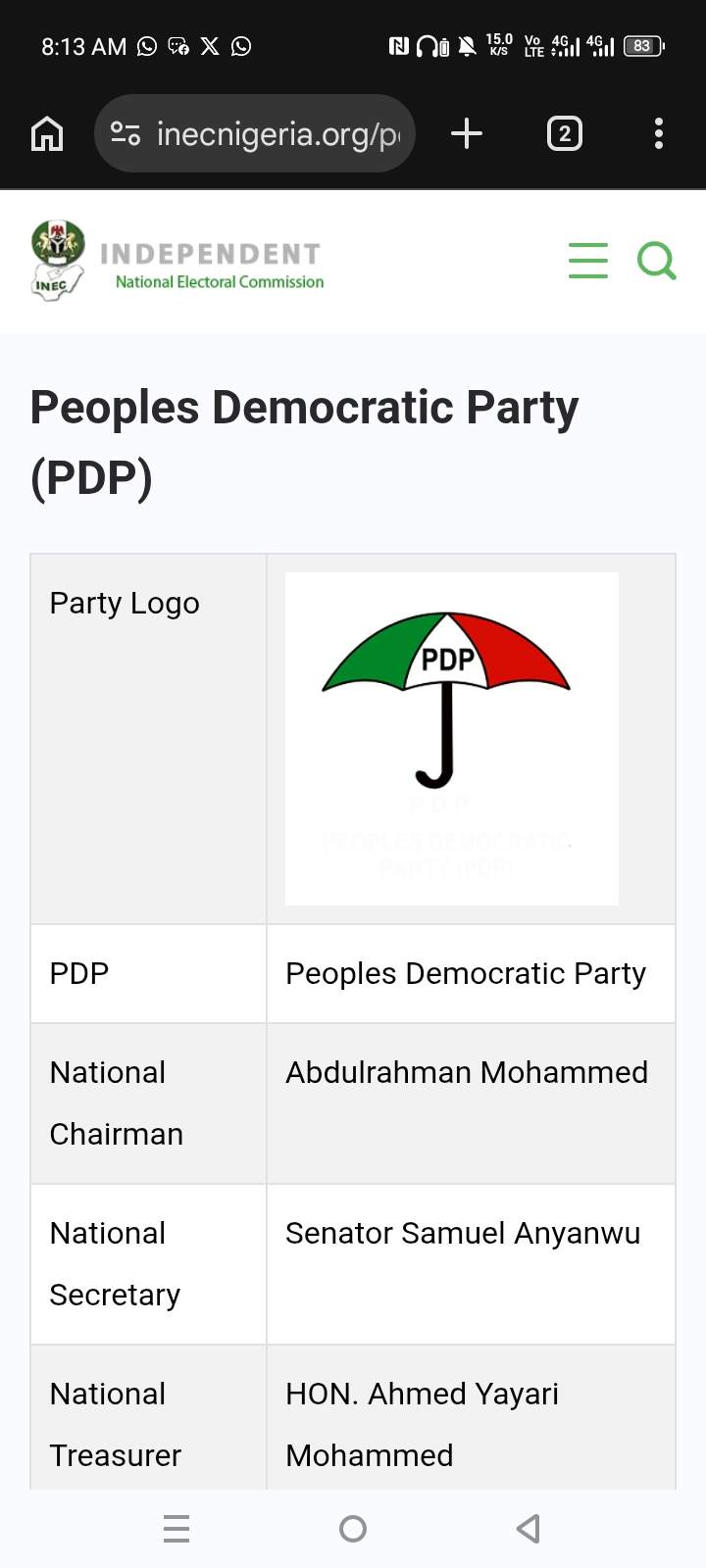 The Independent National Electoral Commission (INEC) has officially published the name of Abdulrahman Mohammed as the National Chairman of the People’s Democratic Party (PDP) on its website.