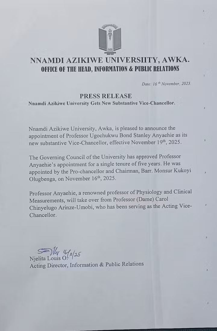 Nnamdi Azikiwe University, Awka, has announced the appointment of Professor Ugochukwu Bond Stanley Anyaehie as the institution’s new substantive Vice-Chancellor, effective November 19, 2025.