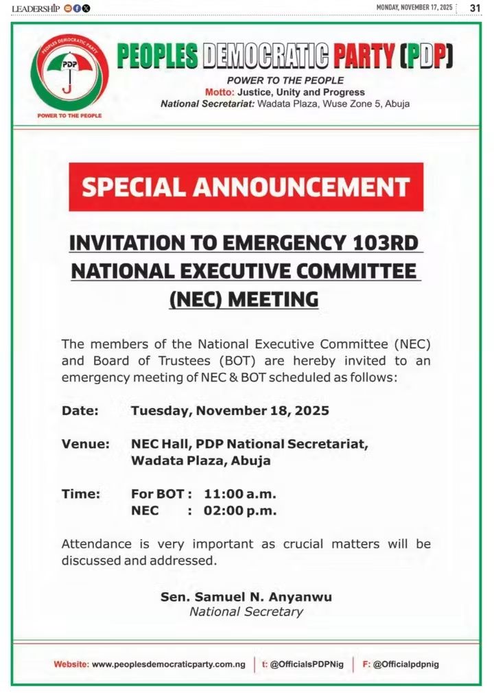 The Peoples Democratic Party (PDP) has issued a special announcement inviting members of its National Executive Committee (NEC) and Board of Trustees (BOT) to an emergency meeting scheduled for Tuesday, November 18, 2025.