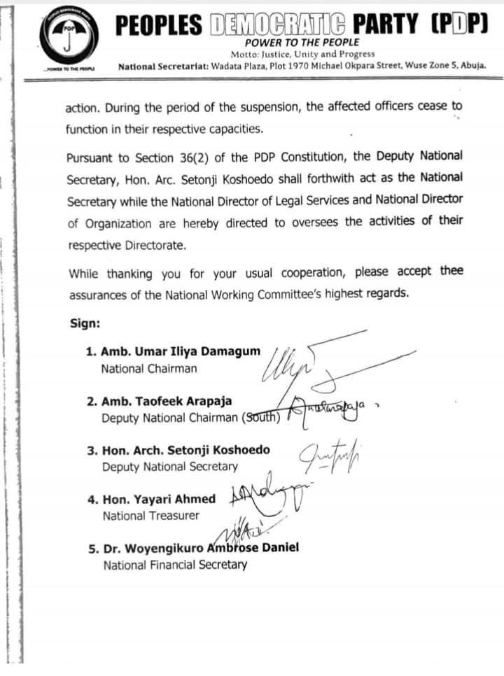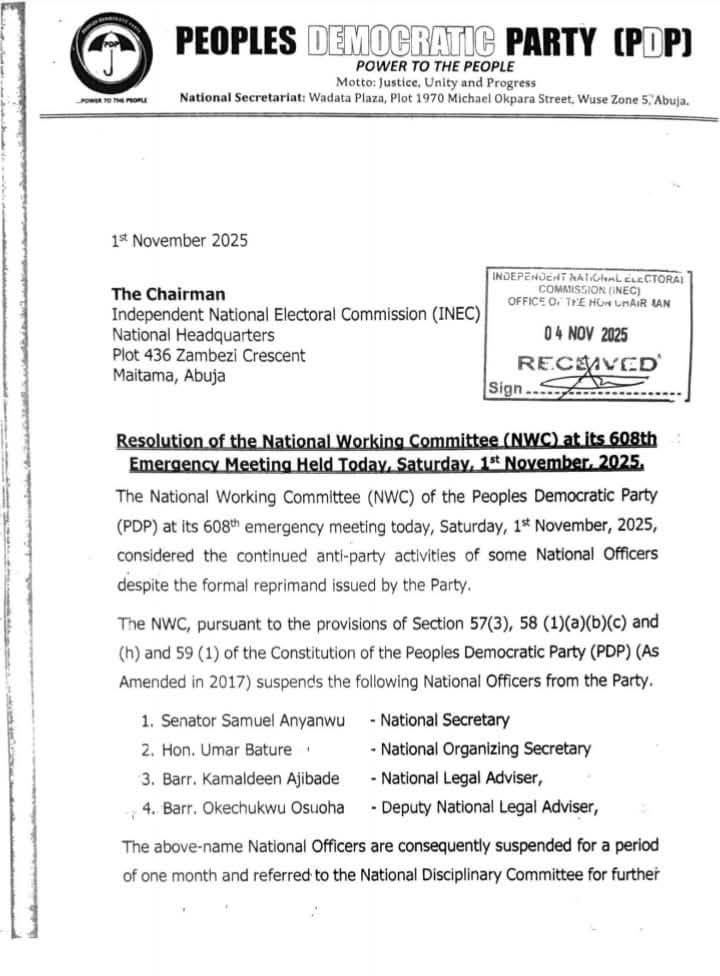 The Independent National Electoral Commission (INEC) has formally received the resolution of the Peoples Democratic Party (PDP) National Working Committee (NWC) suspending four of its top national officers.