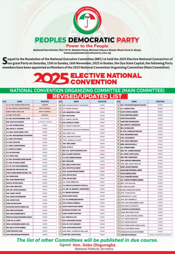 The Peoples Democratic Party (PDP) has released the revised and updated list of members appointed into the 2025 National Convention Organizing Committee (Main Committee) ahead of its Elective National Convention scheduled to hold from Saturday, November 15 to Sunday, November 16, 2025, in Ibadan, Oyo State.