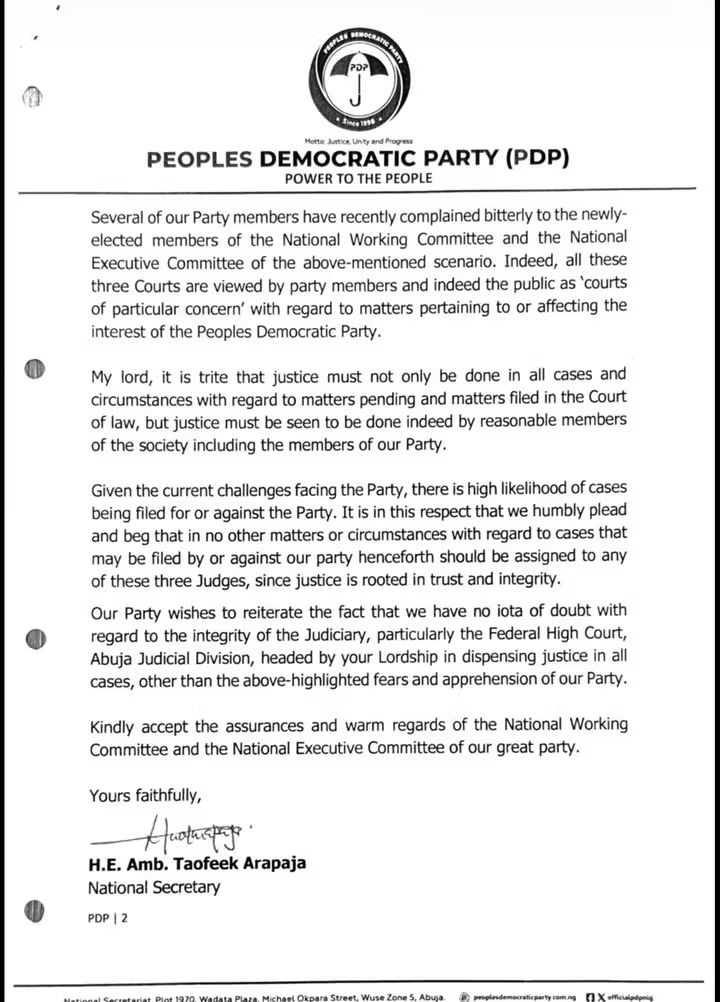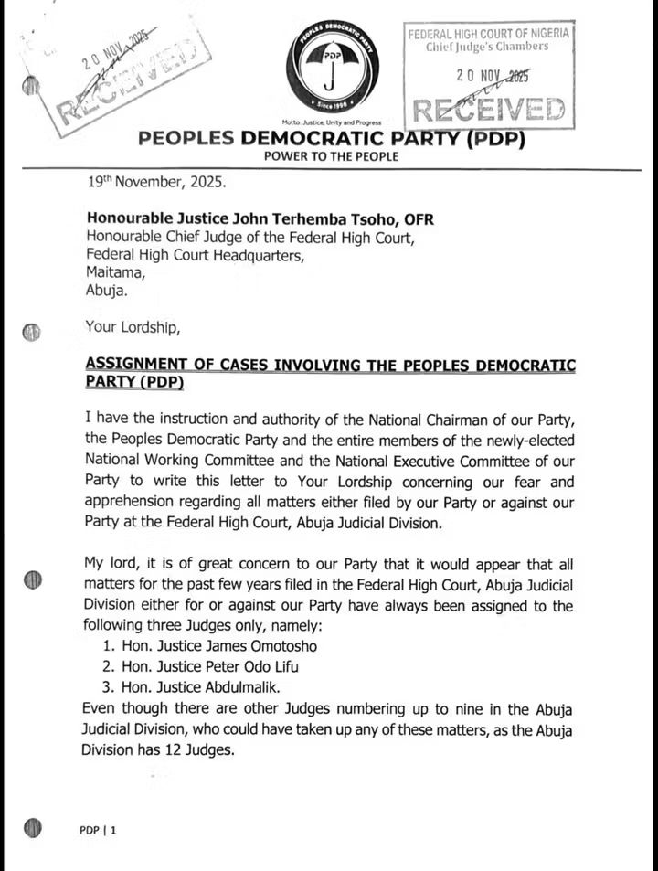 In a letter dated November 19, 2025, and signed by the National Secretary, H.E. Amb. Taofeek Arapaja, the PDP expressed deep concern that for several years, all matters filed either by or against the party at the Federal High Court, Abuja, have consistently been assigned to three judges only