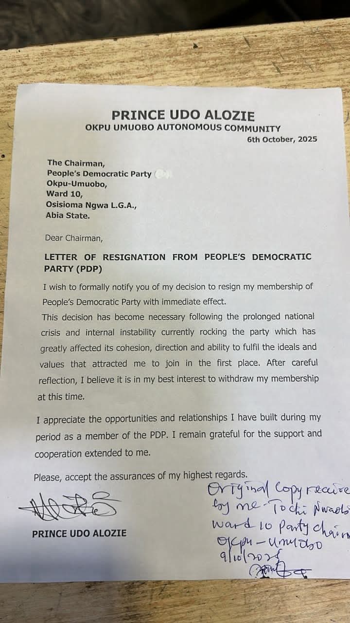 In a letter dated 6th October 2025 and addressed to the PDP Chairman of Ward 10, Osisioma Ngwa LGA, Abia State, Alozie cited prolonged national crisis and internal instability within the party as the major reasons for his departure. According to him, the turmoil has severely affected the party’s cohesion and its ability to uphold the ideals and values that originally motivated him to join.