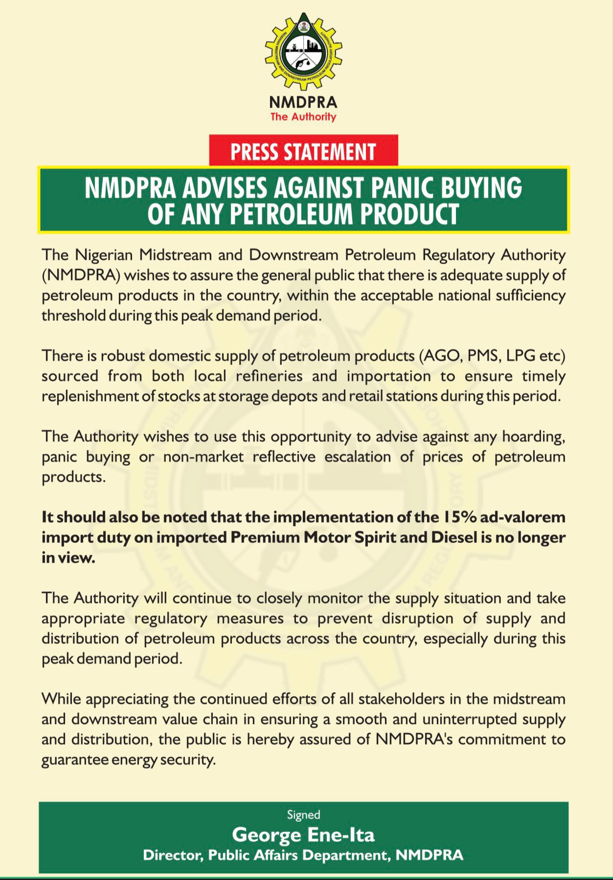 In a statement signed by George Ene-Ita, Director of the Public Affairs Department, the Authority emphasized that there is a robust domestic supply of petroleum products—including AGO, PMS, and LPG—sourced from local refineries and imports to ensure timely replenishment of stocks at depots and filling stations during this peak demand period.