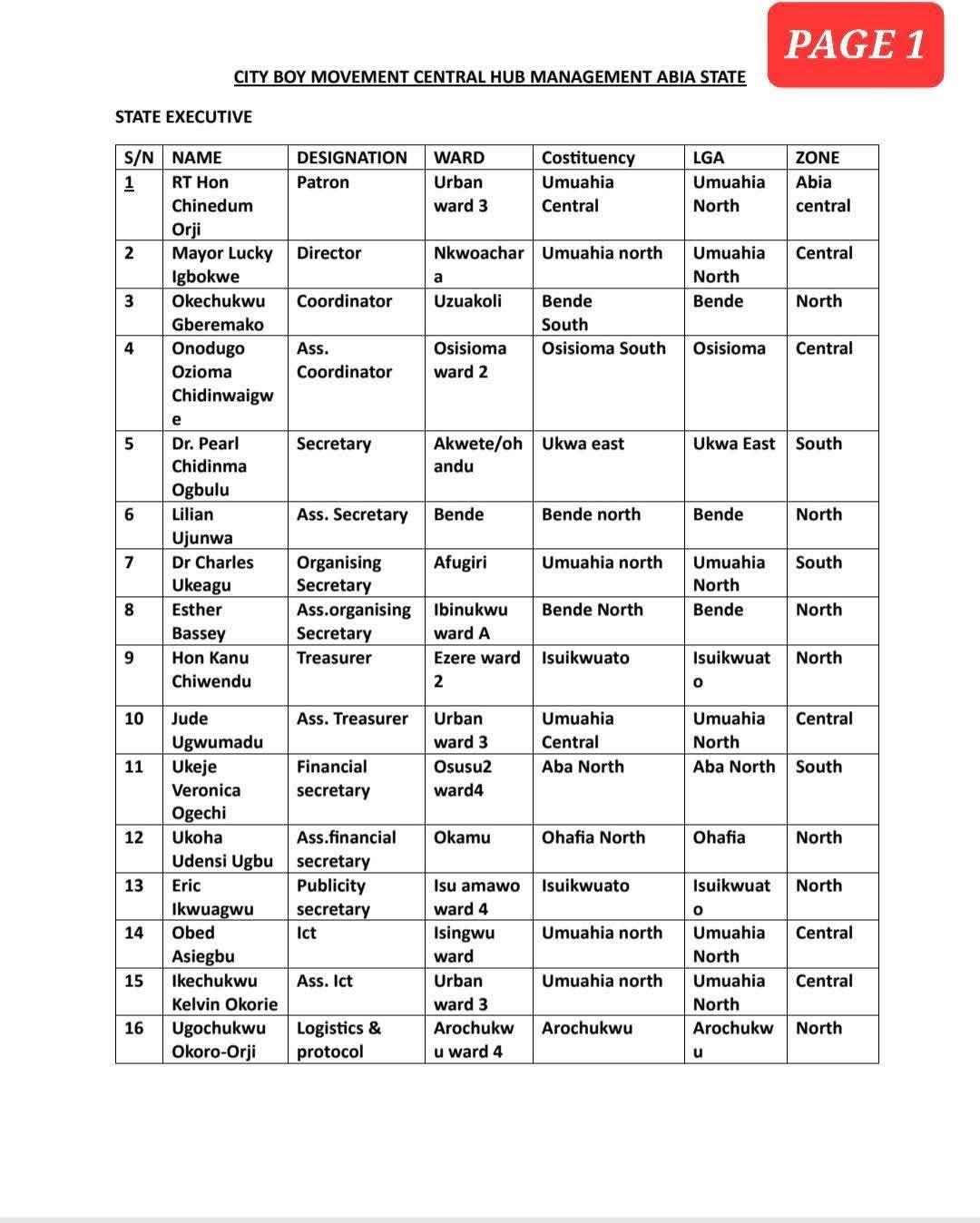 The Abia State Chapter of the City Boy Movement has officially unveiled the list of officers constituting its Central Management Hub, the apex coordinating body responsible for overseeing the activities of the Movement across the state.