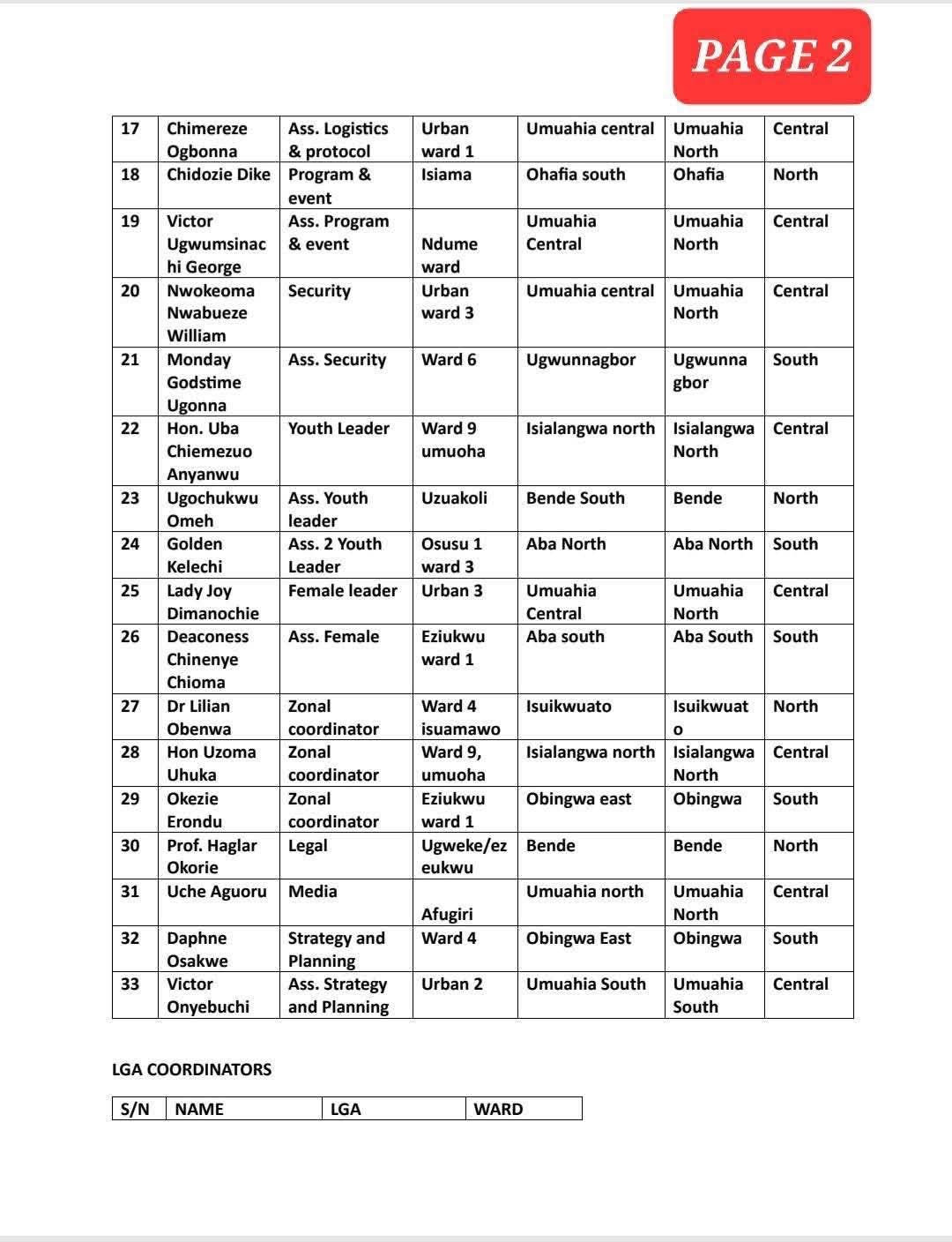 He noted that the newly constituted body will serve as the principal administrative and operational structure of the Movement in Abia State, with clearly defined departmental responsibilities aimed at enhancing coordination, mobilization, and strategic engagement with supporters.