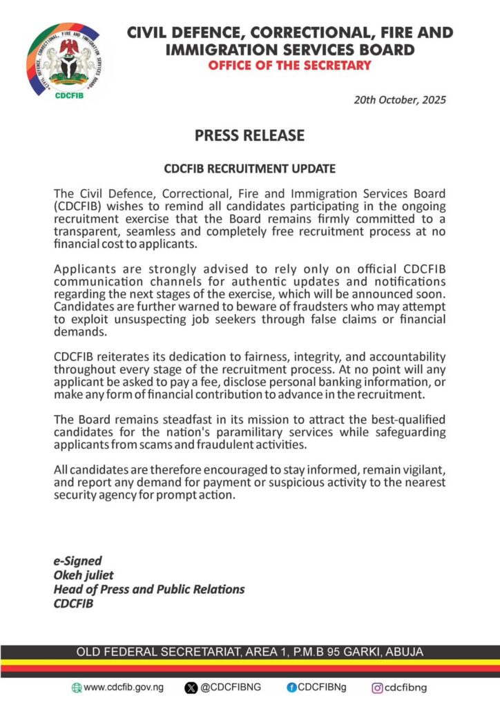 The Board reiterated its mission to attract the best-qualified candidates for Nigeria’s paramilitary services while safeguarding applicants from scams and fraudulent activities.