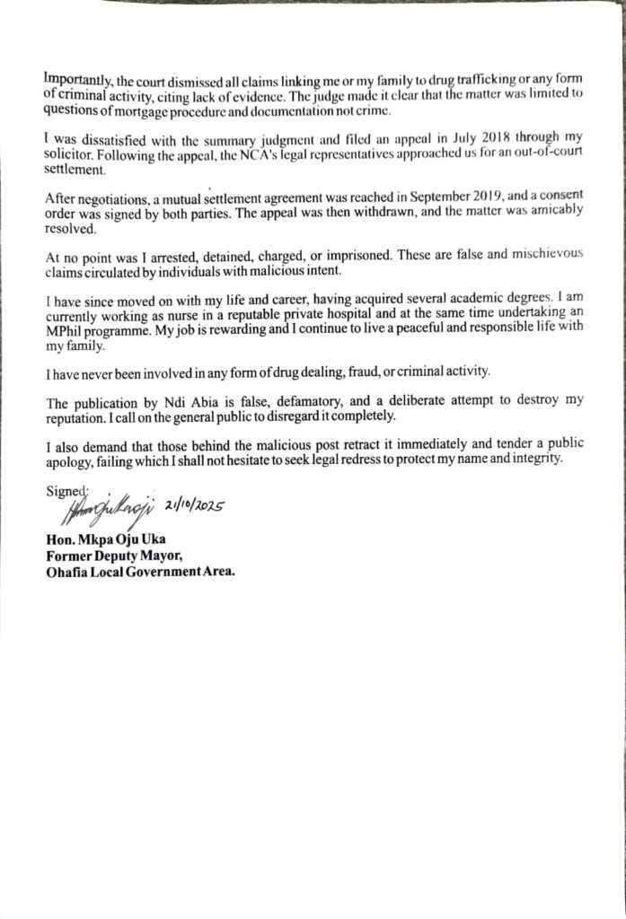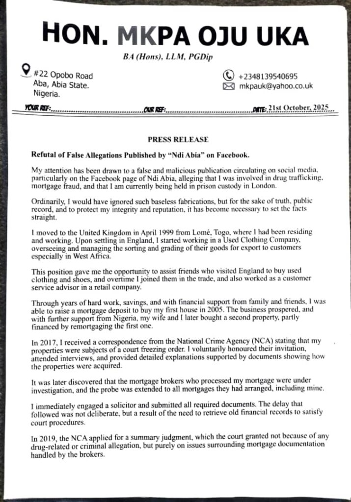 Former Deputy Mayor of Ohafia Local Government Area, Hon. Mkpa Oju Uka, has dismissed as false and malicious the social media report alleging that he was involved in drug trafficking, mortgage fraud, and is currently in prison custody in London.