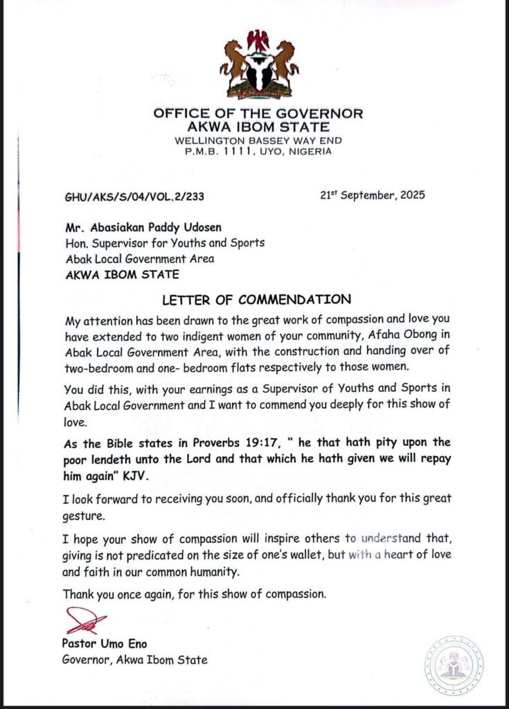 In a Letter of Commendation personally signed by the Governor and shared on the official Facebook handle of his Chief Press Secretary, Ekerete Udoh, Governor Eno described the act as a remarkable display of compassion and love.