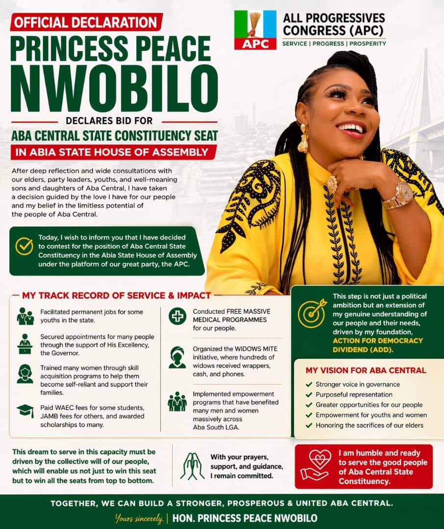 Hon. Princess Peace Nwobilo has officially declared her intention to contest for the position of Member representing Aba Central State Constituency in the Abia State House of Assembly under the platform of the All Progressives Congress (APC).