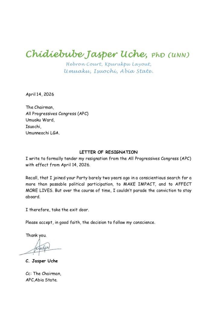 In a resignation letter dated April 14, 2026, Uche stated that his decision to leave the APC was driven by his desire to follow his conscience after nearly two years in the party.