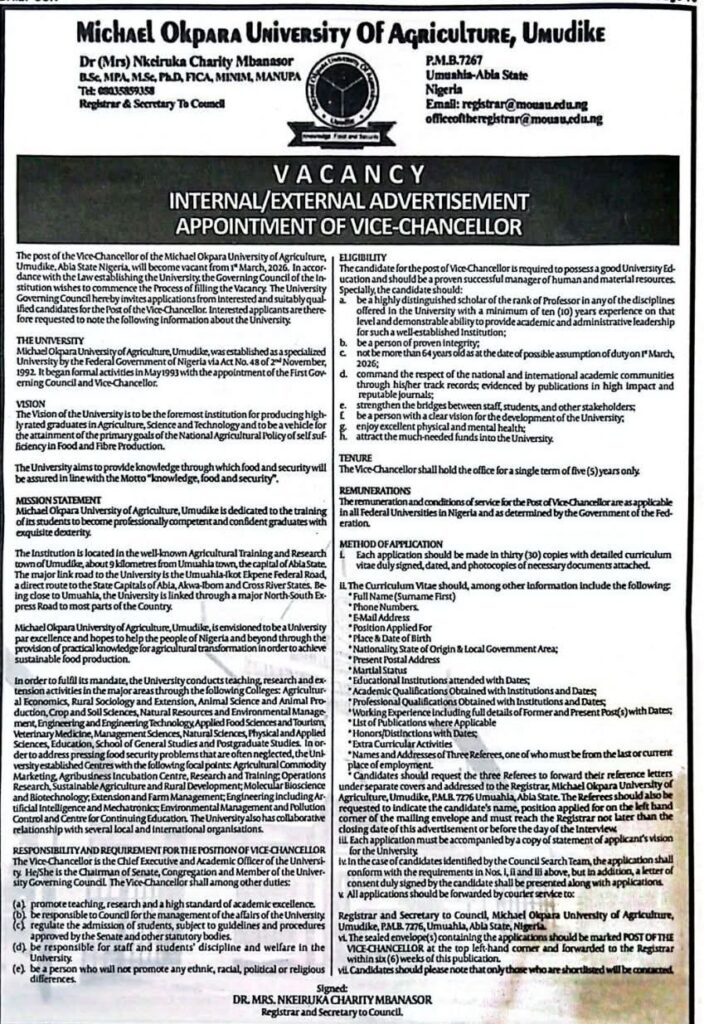 Michael Okpara University of Agriculture, Umudike, MOUAU Abia State, has officially declared the position of Vice-Chancellor vacant, effective March 1, 2026.