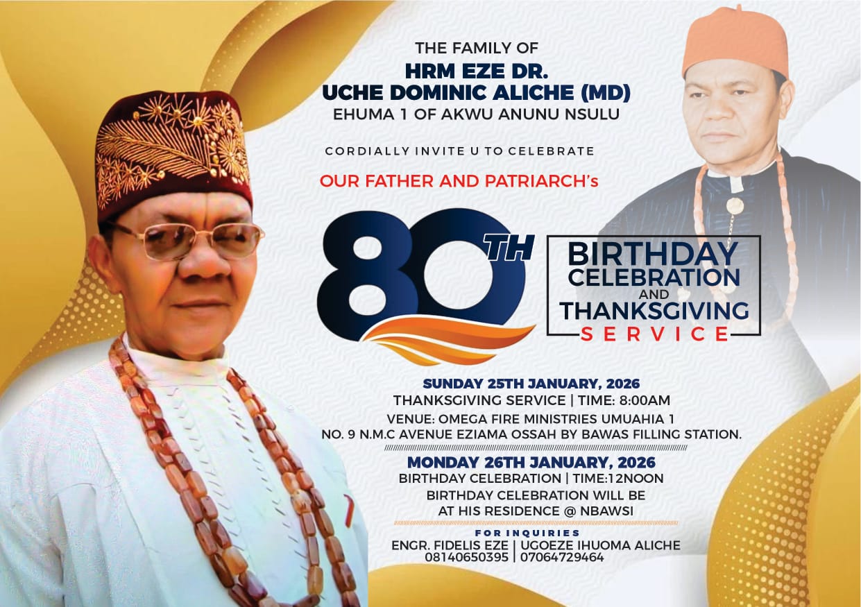 Oha Nsulu Unity Forum, ONUF, Isiala Ngwa North LGA Abia State has sent hearty felicitations to His Royal Majesty, Eze Dr. Uche Dominic Aliche (The Ehuma 1 Of Akwu Anunu) on the auspicious occasion of his 80th birthday celebration.