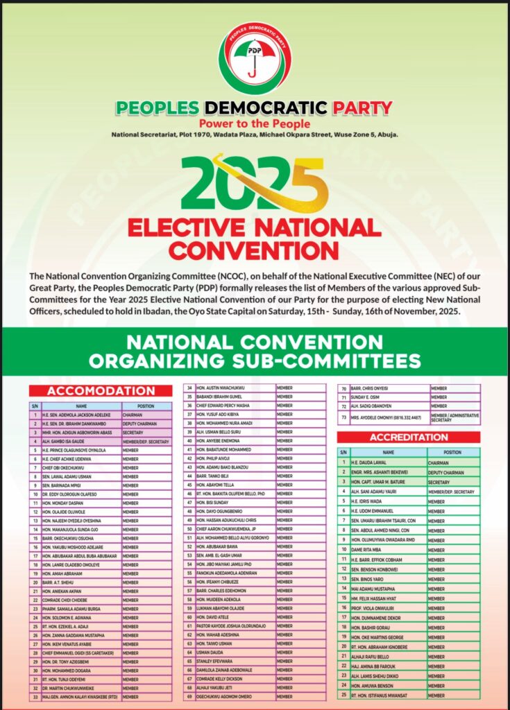 The Peoples Democratic Party (PDP) has formally announced the composition of sub-committees that will oversee preparations for its much-anticipated 2025 Elective National Convention. The announcement was made through the National Convention Organizing Committee (NCOC), acting on behalf of the National Executive Committee (NEC) of the party.