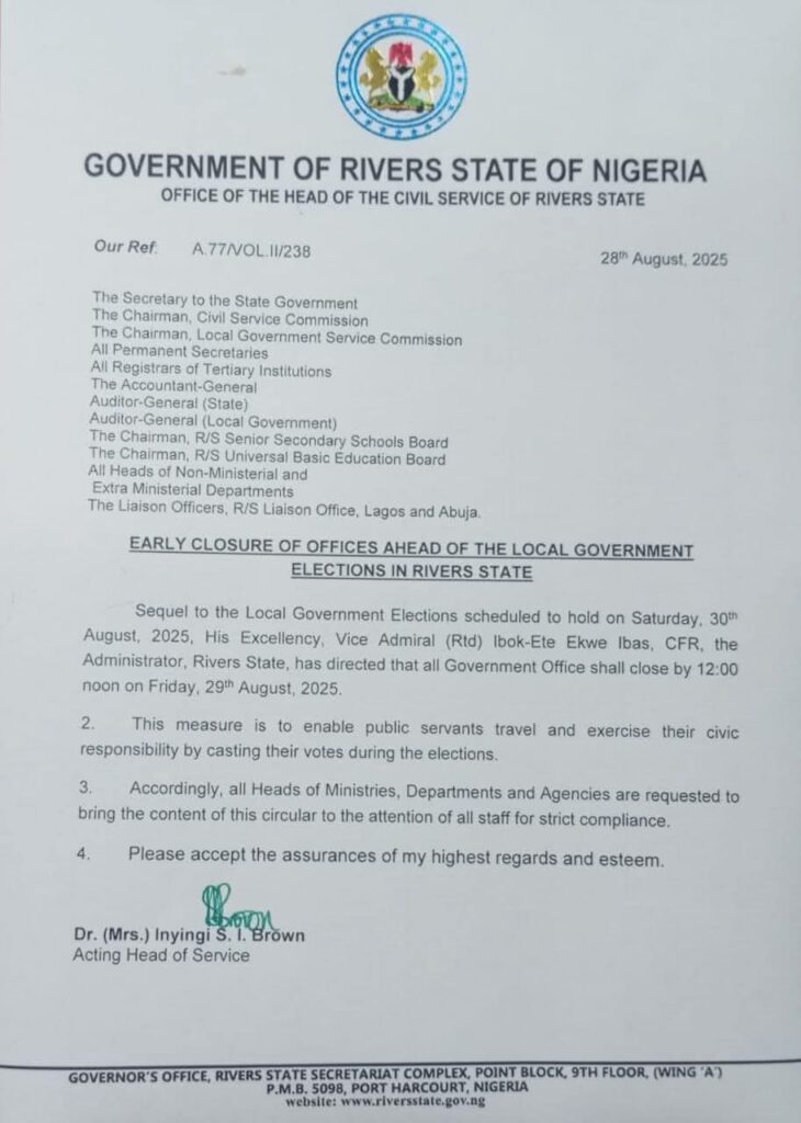 The Rivers State Government has directed all public offices in the state to close early on Friday, August 29, 2025, ahead of the local government elections scheduled for Saturday, August 30, 2025.
