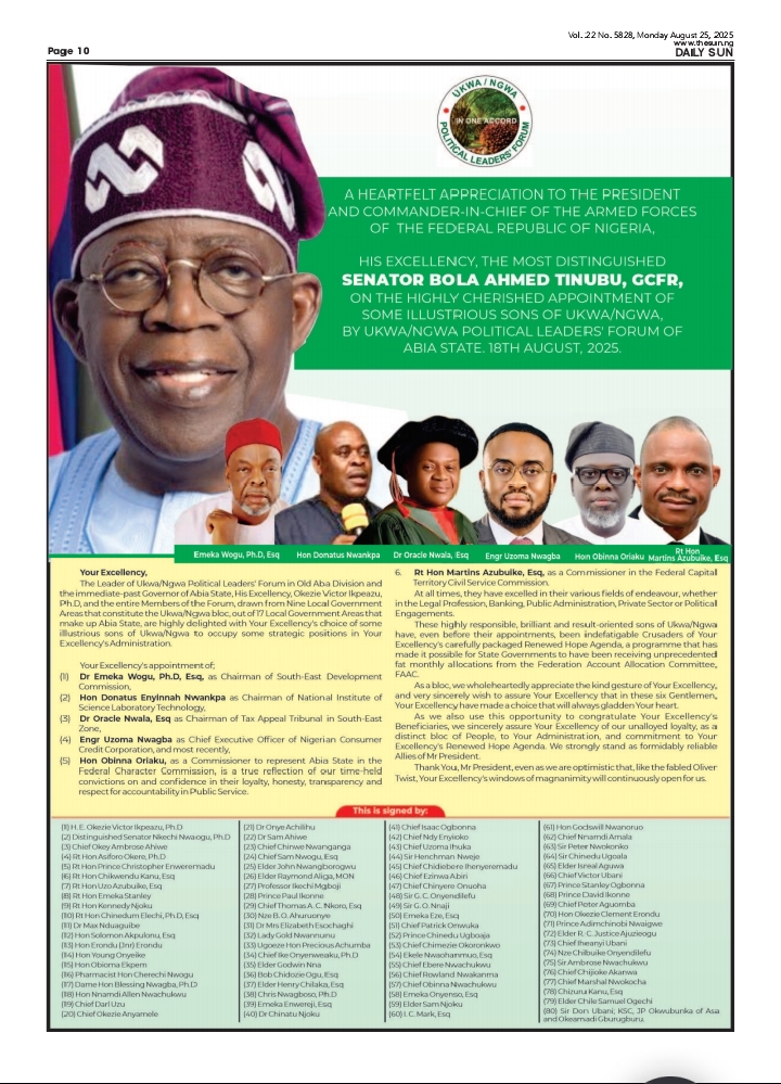 The Ukwa/Ngwa Political Leaders’ Forum of Abia State has expressed profound appreciation to President Bola Ahmed Tinubu, GCFR, for appointing several illustrious sons of Ukwa/Ngwa extraction into strategic national positions.
